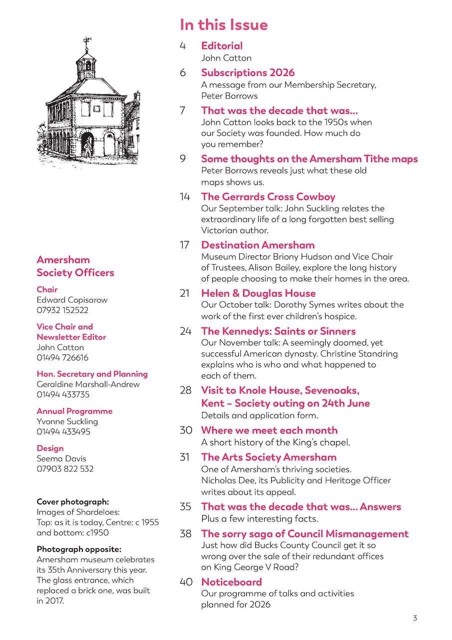 News January 2026 Newsletter Published 17 Jan 2026Amersham Society January 2026 Newsletter is now published and has been delivered to the Society members. January 2026 Newsletter, photos (from top): Shardeloes today, in c1955 and in c1950 January 2026 Newsletter, contentsRead Society Newsletters »